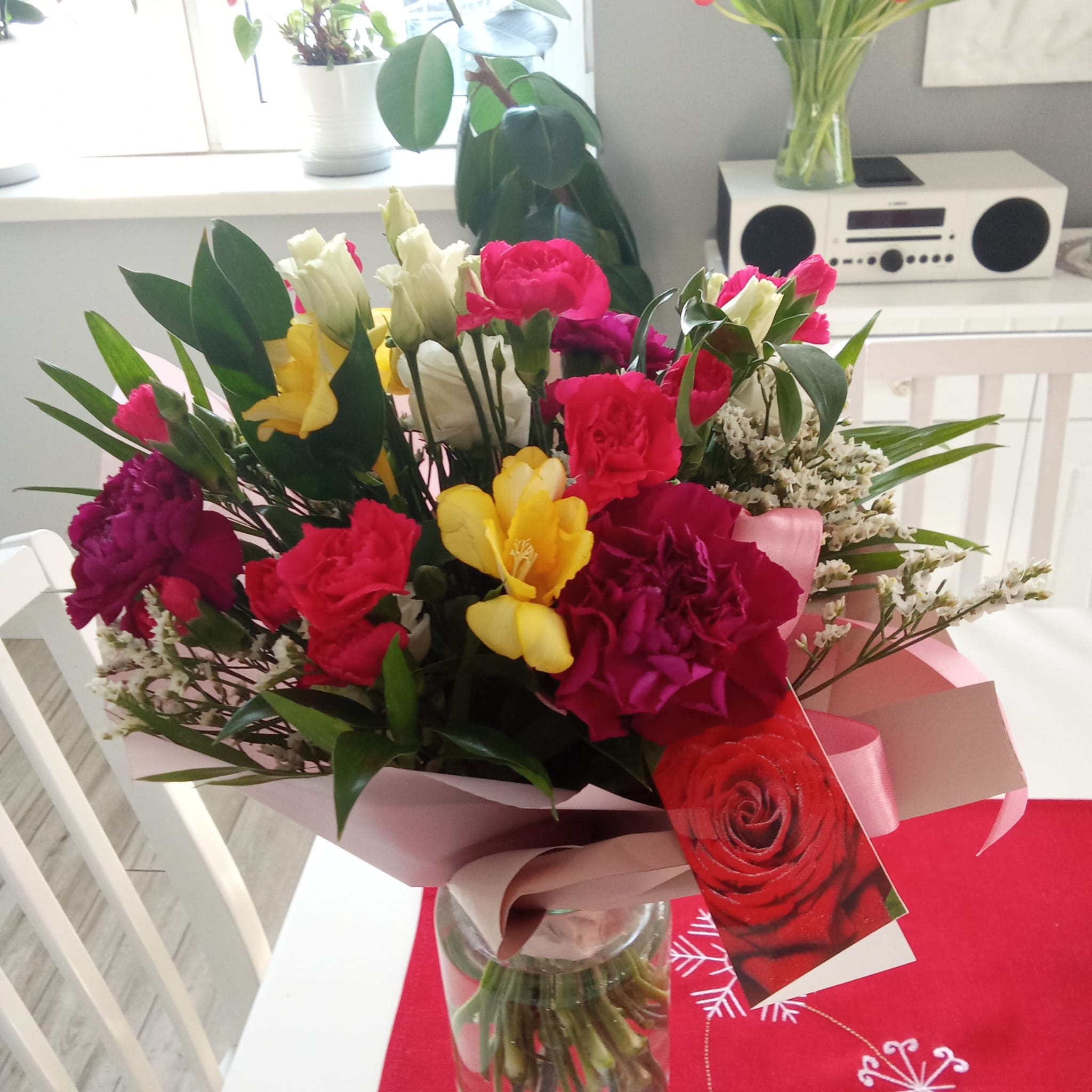 Zdjęcie produktu ma charakter poglądowy i stanowi przykładową kompozycję. Bukiet wykonywany jest z kwiatów dostępnych w dniu realizacji, dlatego jego skład oraz kolorystyka mogą się różnić od prezentowanych na zdjęciu.